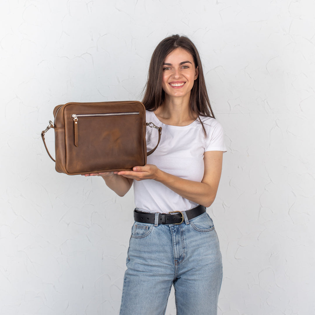 This is a leather crossbody bag with a classic design, crafted from high-quality genuine leather.