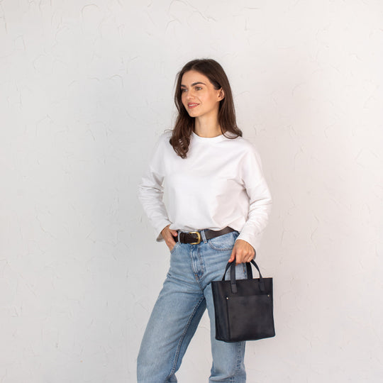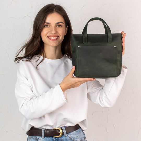 This handmade women mini tote bag is produced by cowhide leather. It has one pocket inside. The bag has a high-quality zipper that secures your belongings. It holds the shape perfectly and you may be confident that your things like cell phone, tablet, etc. This bag is simple, reliable, and durable. Its universal look allows using the tote bag for various purposes. One may take the bag to the work, shopping, meeting, or walk and feel comfortable with it in any condition.