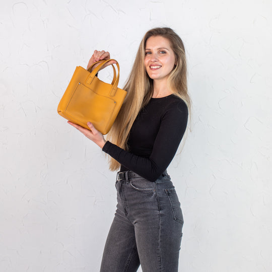 This handmade women mini tote bag is produced by cowhide leather. It has one pocket inside. The bag has a high-quality zipper that secures your belongings. It holds the shape perfectly and you may be confident that your things like cell phone, tablet, etc. This bag is simple, reliable, and durable. Its universal look allows using the tote bag for various purposes. One may take the bag to the work, shopping, meeting, or walk and feel comfortable with it in any condition.