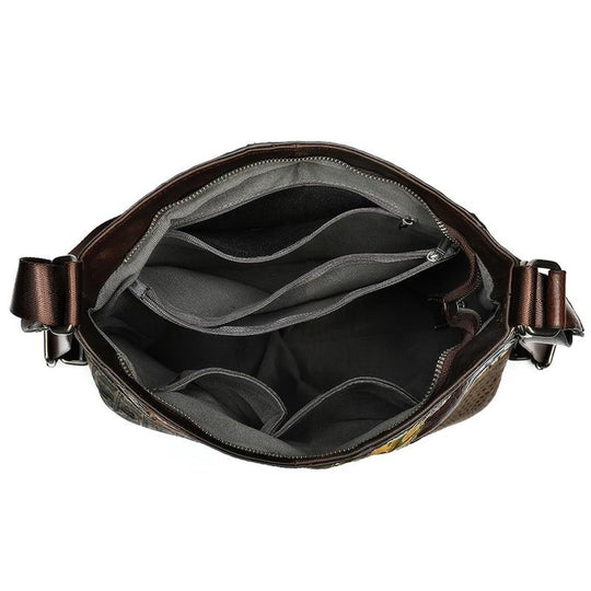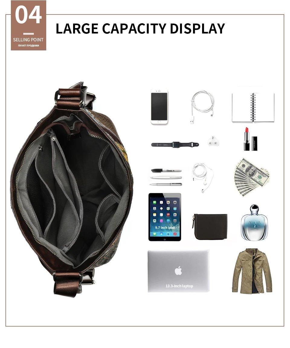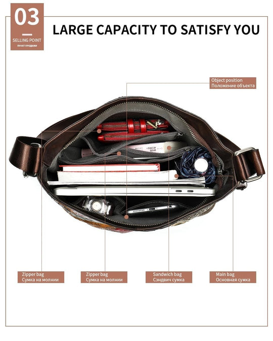 Le principal problème lors du choix d'un sac est souvent de choisir parmi la multitude de modèles et de motifs disponibles. Grâce à ce sac bandoulière convertible Boho, qui fait également office de sac à dos, ce dilemme est désormais chose du passé ! Ce sac arbore une charmante palette de motifs qui s'harmonisent harmonieusement, témoignant d'un savoir-faire exquis. Outre son apparence adorable, il est confectionné en cuir véritable résistant, agrémenté de solides sangles marron solidement cousues. L'intérieur est soigneusement doublé et doté de multiples compartiments, offrant un espace généreux pour tous vos essentiels scolaires ou professionnels. Fini le choix difficile avec ce sac mignon et pratique !