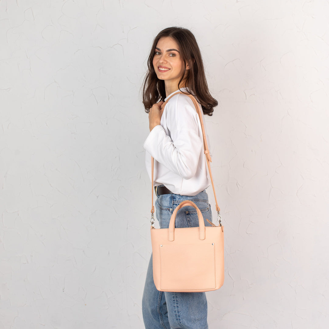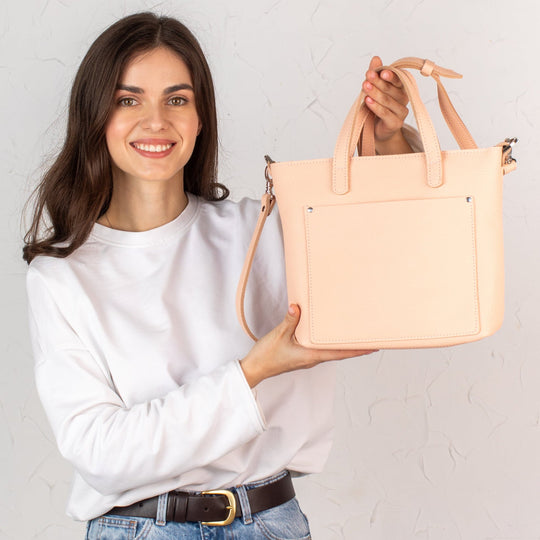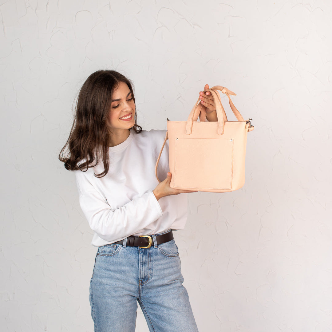 This handmade women mini tote bag is produced by cowhide leather. It has one pocket inside. The bag has a high-quality zipper that secures your belongings. It holds the shape perfectly and you may be confident that your things like cell phone, tablet, etc. This bag is simple, reliable, and durable. Its universal look allows using the tote bag for various purposes. One may take the bag to the work, shopping, meeting, or walk and feel comfortable with it in any condition.