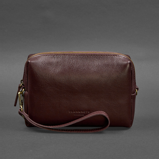 The interior of the bag features a spacious compartment with a divider/holder for small items. The accessory can be worn on the wrist using the detachable 20 cm leather strap.